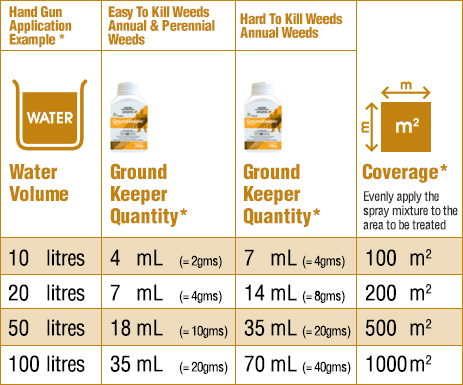 The Ground Keeper label recommends rates in grams. The following table can be used as a guide to measure Ground Keeper herbicide using common measure cups graduated in millilitres (mL). If you have access to scales that can weigh small amounts, this will be a more accurate measure. The example used below is for Weed control using high volume hand gun application. Ground Keeper is not designed to kill large established weeds.